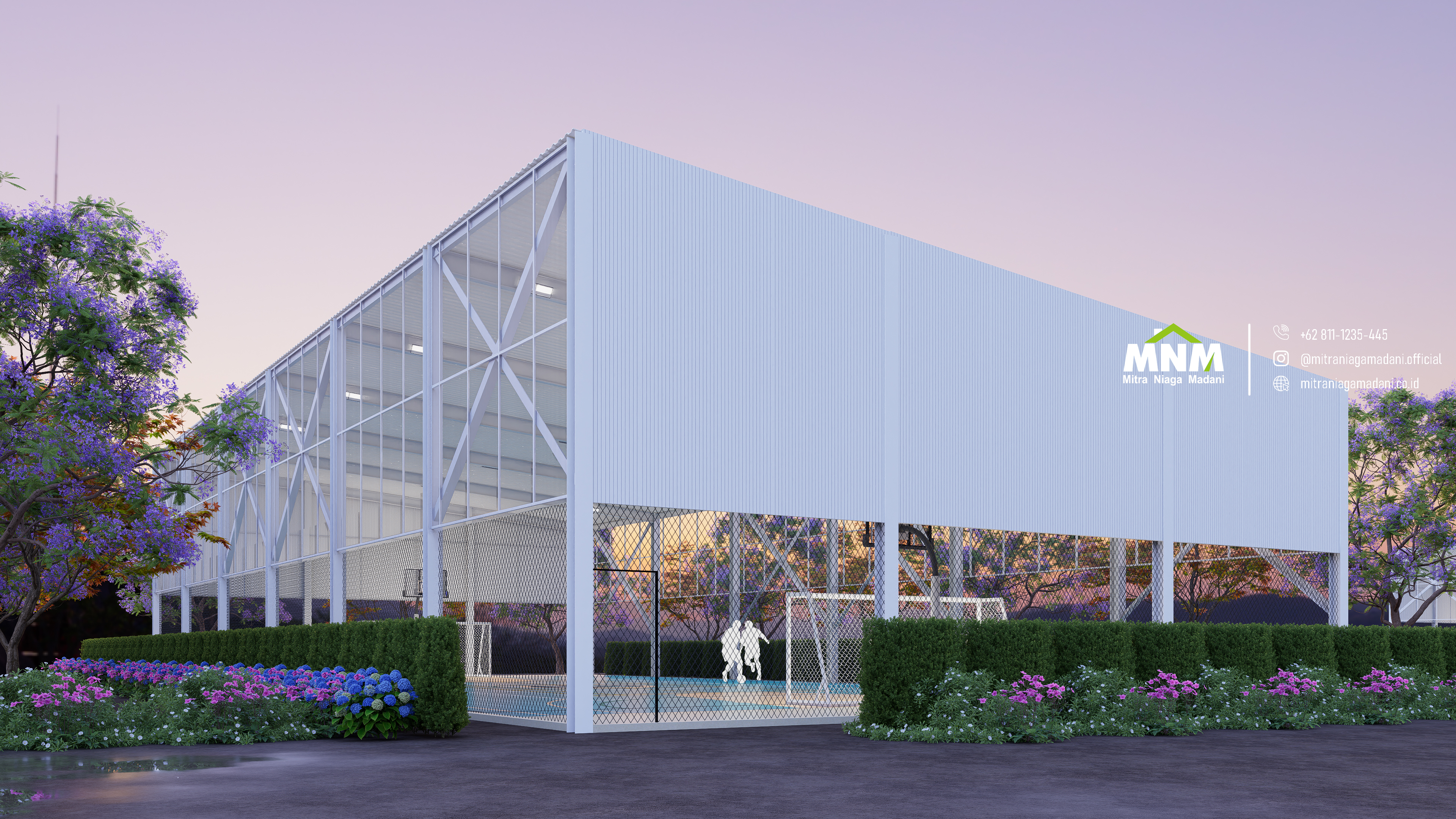 Lapangan olahraga ini dirancang menggunakan struktur baja yang kokoh dengan desain terbuka pada bagian samping, memberikan sirkulasi udara alami yang optimal. Konsep ini sangat cocok untuk iklim tropis, karena mampu menjaga kenyamanan pengguna tanpa mengurangi perlindungan dari cuaca.